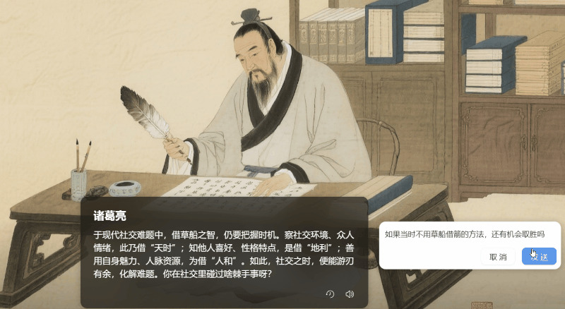 《草船借箭》课件中的AI智能体,生可向AI提问(图源:希沃AI教学空间)