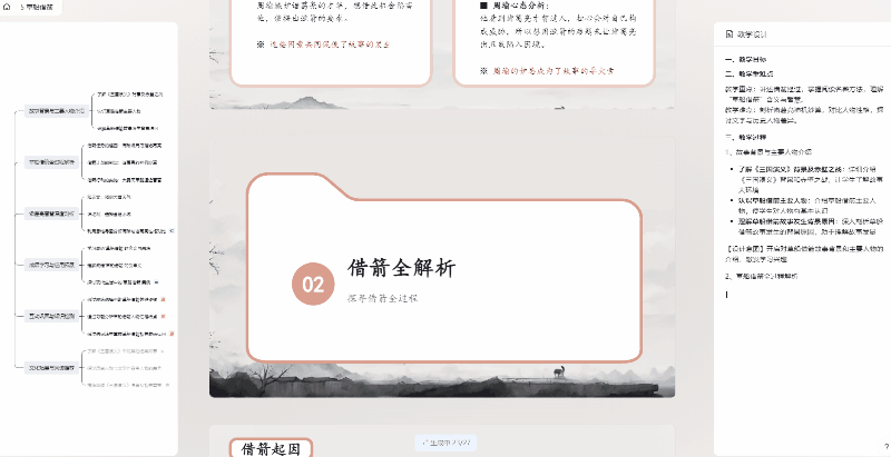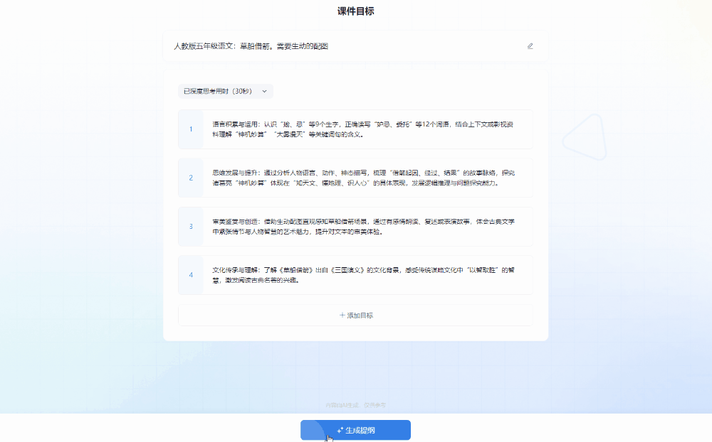 输入《草船借箭》的课件目标后,快速生成对应提纲(图源:希沃AI教学空间)